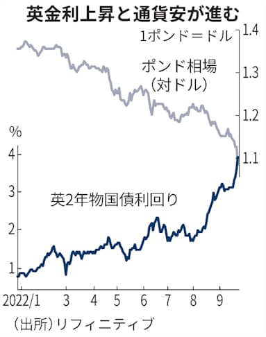 【ロンドン=篠崎健太】23日のロンドン金融市場で英国債の利回りが急騰した。2年債は前日より一時0.4%あまり上昇(債券価格は下落)して4%を上回り、2008年10月以来約14年ぶりの高水準になった。トラス政権が大規模な減税策と国債の増発計画を打ち出し、財政や債券需給の悪化懸念が強まった。英通貨ポンドは対ドルで37年ぶりの安値をつけ、英国株も下げて「トリプル安」になった。