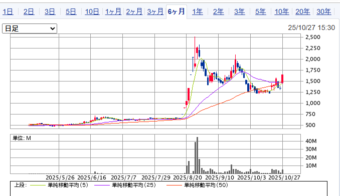 コメント - 規模が小さい銘柄かつテーマ連動銘柄なので、材料が出ると急動意化しやすいですが、逆に材料出尽くし・反動も早い可能性あり。